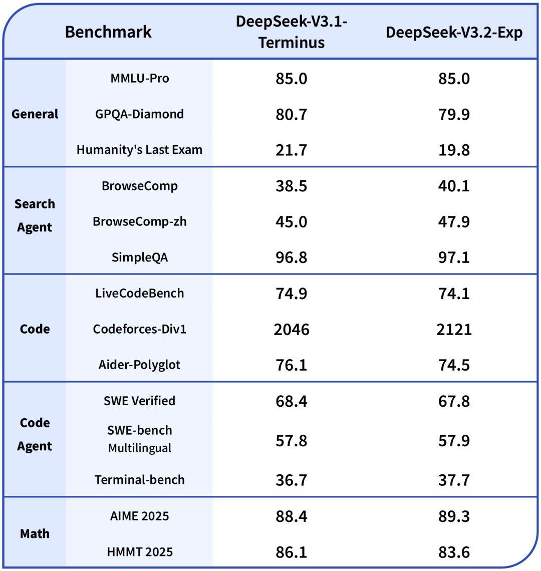 在各领域的公开评测集上,DeepSeek-V3.2-Exp 的表现与 V3.1-Terminus 基本持平。